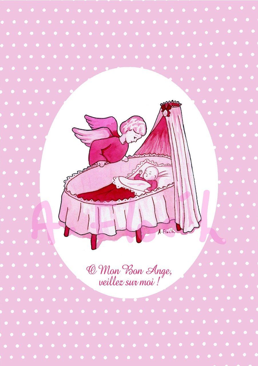 Reproduction d'une illustration représentant un ange penché sur le berceau d'un bébé et la phrase "O mon bon ange, veillez sur moi !"